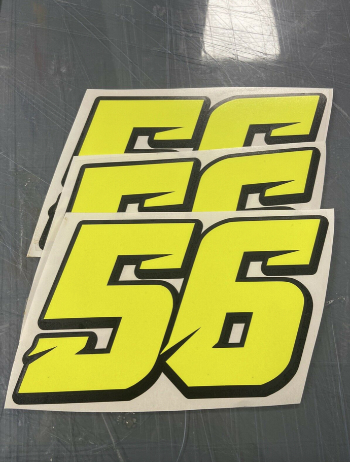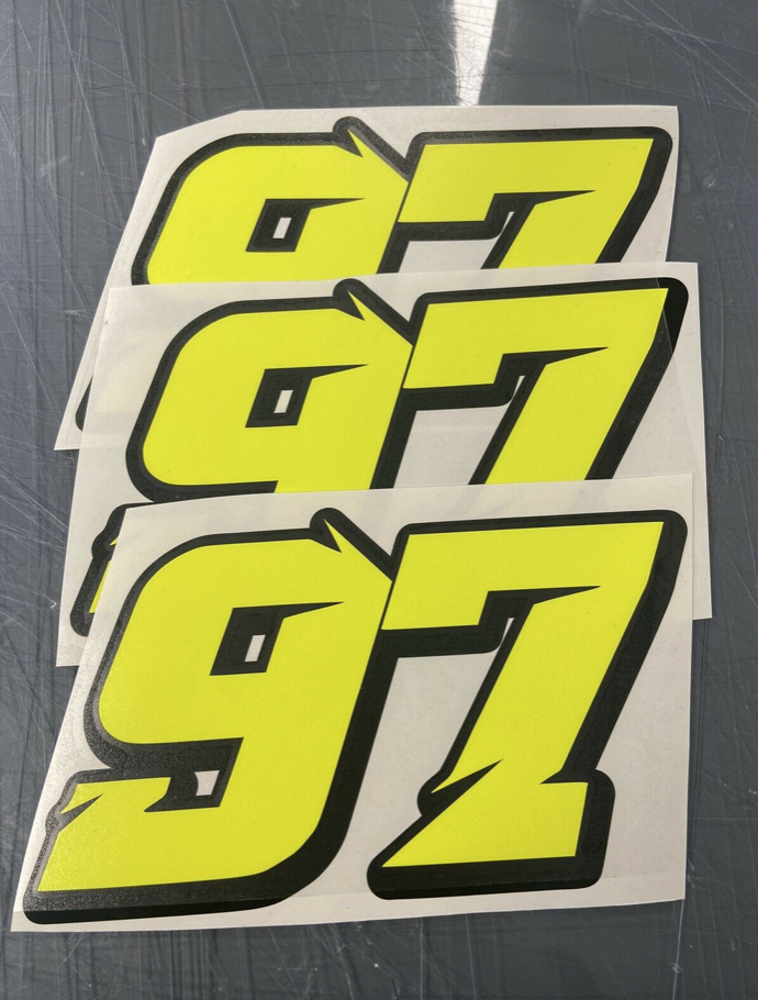3 X Custom Race Numbers Vinyl Stickers/Decals - Fluorescent Day-Glo Neon Yellow